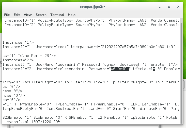 第5步完了之后,myconf.xml就已经是明文的xml文件了,如果你只是想找出来超级用户的密码和同时上网设备限制值,并不打算修改这两项,那就可以直接在路由器下用grep命令查找出来。命令如下: