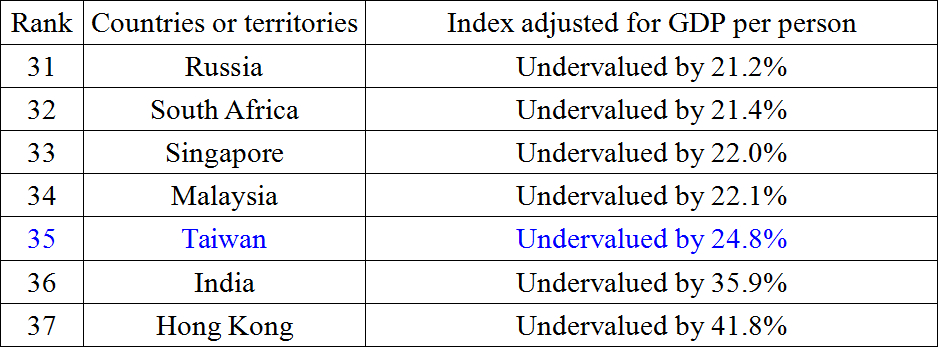 除了純粹比較大麥克漢堡價格以外,還存在考慮人均GDP的比法。