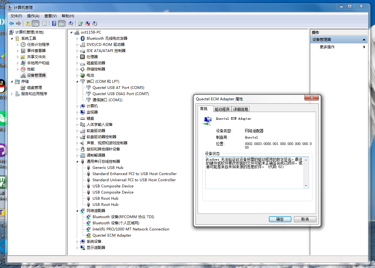 回覆:移远EC200A模块USB接口插入电脑后,会出来4个USB设备 [圖片]64位的win7系统也可以安装驱动,但是Quectel ECM Adapter这个设备需要系统禁用驱动数字签名后才能用。没办法,微软放弃win7了,已经停止给win7的新驱动签名了。