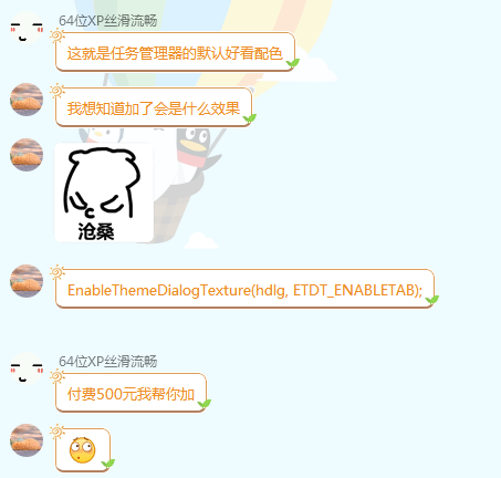 stem技术总监表示,要给500块钱,他才愿意给他的任务管理器加EnableThemeDialogTexture(hdlg, ETDT_ENABLETAB);
