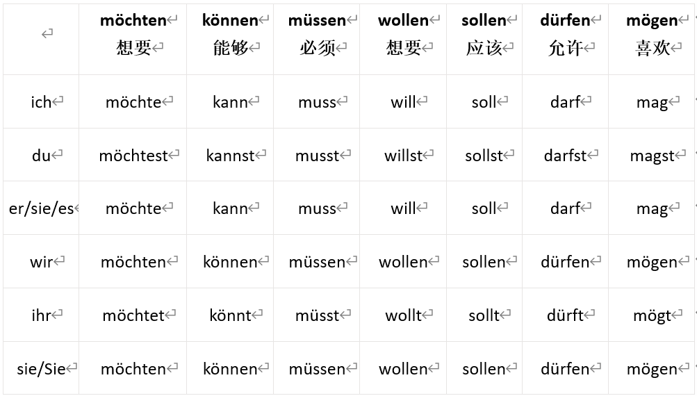 注意:①第一人称单数和第三人称单数形式相同;②möchten 是 mögen 的第二虚拟式,但已作为独立的情态动词使用,表示委婉的愿望。