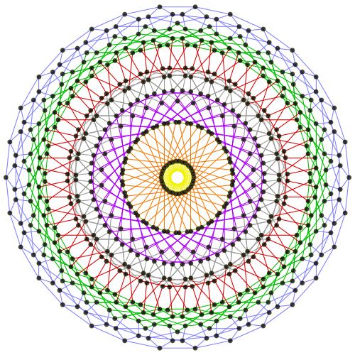 类比是一个坐落在四维的双曲堆砌(Hyperbolic honeycomb in 4 dimension),每个面上有三个正120胞体 再另外,根据120-cell的600个顶点重新连线“连面”可以得到十个星形正多胞体的其中一个(Great grand stellated 120-cell)   (带投影面)  平面投影(作法:小的连中等数学都没学完,你问我我问谁)(不过话说回来,这种圆盘结构倒挺美妙的):  补充: