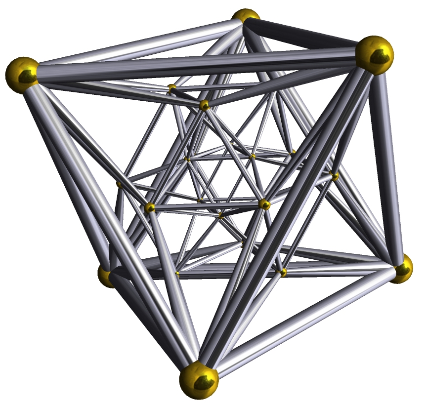 Hexadecachoron 将一个正方形不相邻的两点连线,得到一个正二边形(Demisquare);将一个立方体两两不相邻的四个点沿各自的面连线(Demicube),得到一个正四面体;同样地,将一个超立方体两两不相邻的八个点沿各自的面连线后,正好会得到它的对偶——正16胞体 它穿过我们空间的时候我们会看见一个又零开始匀速增大的正八面体,一段时间后又以相同的速度缩小,直到消失,这便得到一个正16胞体 正十六胞体(16-cell),又作正四面体反棱柱(Tetrahedron antiprism)、 又作Tetracross(四维交叉多胞形(?),日文“4-正轴体”,没有中文翻译)、 又作4-orthoplex(也没有中文翻译,一个N维的orthoplex和cross都指代同一个多胞体,但意义不同)、 又作Demitesseract(照样没有中文翻译,指代第一段超立方体上连线得到的东东,暂时称为半截超立方体) 16-cell,正四面体胞:16,正三角形面:32,棱数:24,顶点数:8(因为是超立方体的对偶,所以它的数据刚好是反过来的) 它的施莱夫利符号也有几个,{3,3,4}(特指它是正多胞体16-cell);  (特指它是orthoplex,代指Demitesseract);h{4,3,3}(alternated[*] tesseract)等等 其顶点图是正八面体,正16胞体每条棱上有4个正四面体 16-
