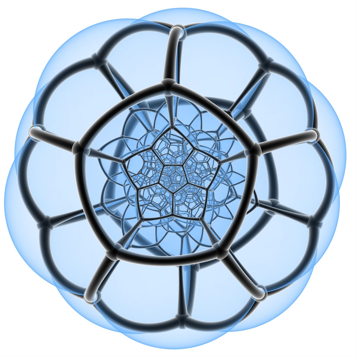 是一个vertex-centered的施莱格尔投影,就是说这个家伙看600-cell眼睛是正对着一个顶点,而不是向前几幅图那样正对着一个多面体胞