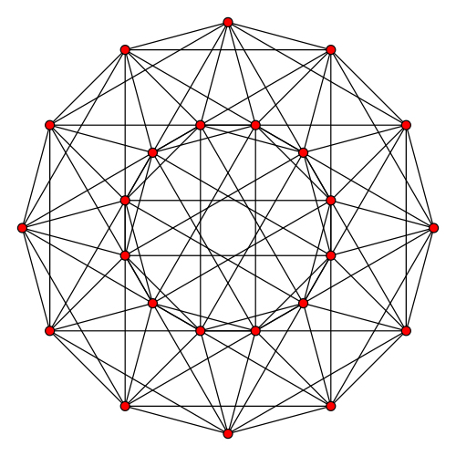 Icositetrachoron 正二十四胞体(24-cell),有时又作复正八面体(octahedral complex),是唯一一个没有三位类比的正多胞体 24-cell,正八面体胞:24,正三角形面:96,棱数:96,顶点数:24(注意到胞数和顶点数,面数和棱数也相等——与正五胞体一样,它也是自身对偶的) 它的施莱夫利符号也有几个,{3,4,3}(特指它是正多胞体24-cell);  (特指它由16-cell截角得到,代指Rectified 16-cell);  (特指它由Demitesseract截角得到,代指Rectified demitesseract——这个东西要涉及Coxeter–Dynkin diagram的,看的懂的求陪同) 其顶点图是立方体,正24胞体每条棱上有3个正八面体 一般而言正方形是24-cell的二维类比,根据它们的施莱夫利符号推算(略)知道,一定意义上它是截半立方体(半正多面体)或菱形十二面体(卡塔兰立体,半正多面体的对偶) 另外,由于正24胞体的二胞夹角也是120°(推导过程不详),因此单用正24胞体也可以组成一个四维堆砌,施莱夫利符号{3,4,3,3},是{3,3,4,3}。每个二维的面上有3个正24胞体   (带投影面)  平行投影(作法不详):  一种没有线条重合的二维投影(非正多边形外框)  旋转图:  一个24-cell穿过三维空间(太快了,我也没看懂)  补充:分层结构 正如正二十面体一样,表面越复杂的立体分层越明显,以正二十面体的一个面(准确地说是把它的表面都膨胀成球后的一个面上)为极点,将纬度相同的几个面记作同一层,那么正二十面体可分作1-3-6-6-3-1六层(有兴趣的筒子可以拿个正二十面体模型玩玩)。