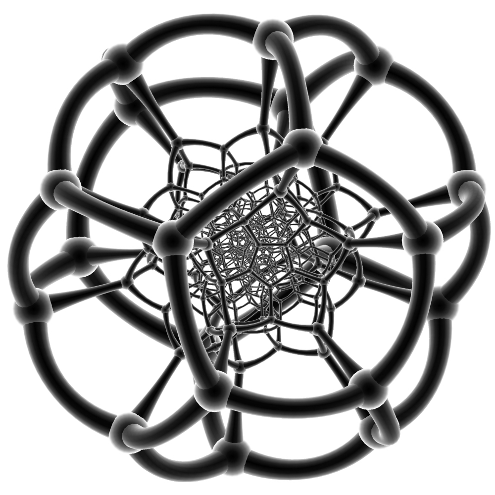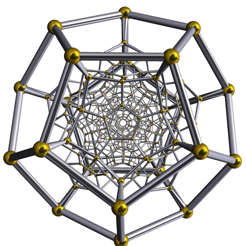 Hecatonicosachoron (最复杂,也是最解说不能的两个来了) 正一百二十胞体(120-cell),又作复正十二面体(Dodecaplex=Dodecahedral complex),超正十二面体(Hyperdodecahedron) 120-cell,正十二面体胞:120,正五边形面:720,棱数:1200,顶点数:600 其施莱夫利符号是{5,3,3},顶点图是正四面体,在正120胞体中每条棱上有三个正十二面体 一般而言,它是正十二面体的四维类比 另