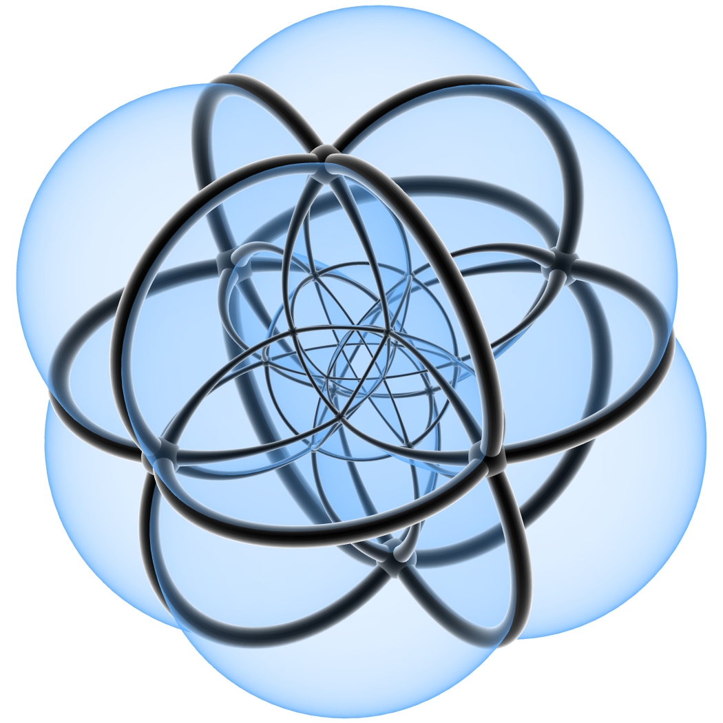 同样地,正二十四胞体也可以这样分,共五层。不过纬度已经不再指一根线了,而是指四维球表面上的一个“纬面”了 1 cell 相当于北极点 8 cells 约莫北纬面60°处 6 cells 赤道面