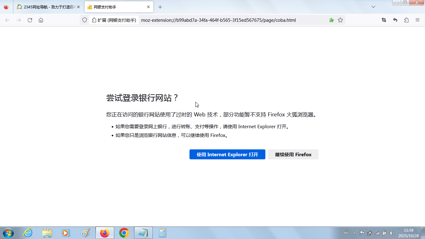 您正在访问的银行网站使用了过时的 Web 技术,部分功能暂不支持 Firefox 火狐浏览器。 如果您需要登录网上银行,进行转账、支付等操作,请使用 Internet Explorer 打开。 如果您只是浏览银行网站信息,可以继续使用 Firefox。