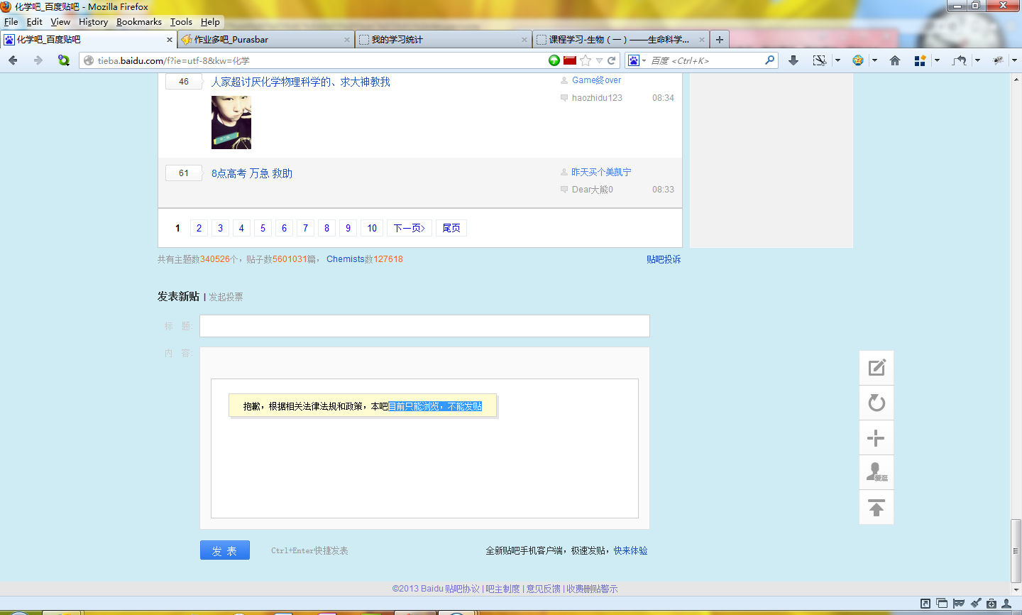 【有图有真相】百度【化学吧】目前只能浏览,不能发贴